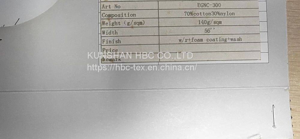 Kunshan HBC Co.Ltd.,(HBC-TEX), (Our before name Shanghai Everglory Textile Co.,Ltd.---GLORY-TEX) have more than 20years experience major in high quality outwear woven fabrics.Our woven fabrics include 100%Cotton , Pes/Ctn (Anti-Static,Flame-retardant), Cotton/Nylon, Nylon/Cotton. NPC., Linen/Cotton, Ramie/Cotton, Tencel , Rayon, Nylon & Polyester(recycled) fabrics.,Fake Leather,etc.We have very strong power in fabric finishing, including kinds of Coating (pigment coating, carbon coating, foam coating, wax coating, oil coating, breathable coating, paper touch coating), Laminate (2layers or 3layers with kinds of film), fabric Bonding, Flocking, Digital printing, Foil printing. DWR, O/R,etc,At same time, we have very good sense to developing new quality based on customer's original sample original design or just first idea.Most of our fabrics are used for leisure style, work wear & function garments.We always keep step with Euro.fashion trend and market, we have long cooperation relationship with Esprit. C&A.Tom Tailor, Next, Luhta.,etc.